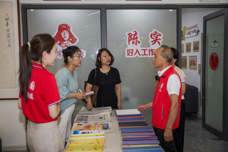 7月25日,湖北省宜昌市伍家岗区大公桥街道金家台社区居委会的工作人员在为采访报道组介绍志愿者陈实的工作事迹。新华网 钟奕 摄
