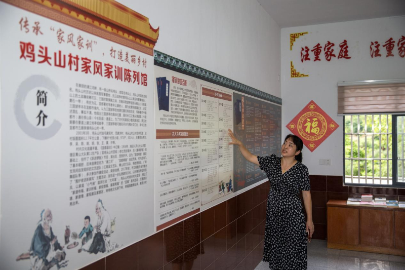 7月25日,湖北省宜都市五眼泉镇鸡头山村村委会工作人员李玉兰为采访报道组介绍鸡头山村家风家训陈列馆的主题内容。新华网 钟奕 摄