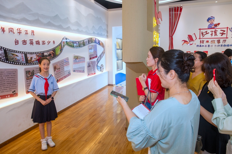 7月25日,湖北省宜昌市实验小学“红领巾讲解员”肖菡西同学为采访报道组介绍“红孩子”绘本故事厅。新华网 钟奕 摄