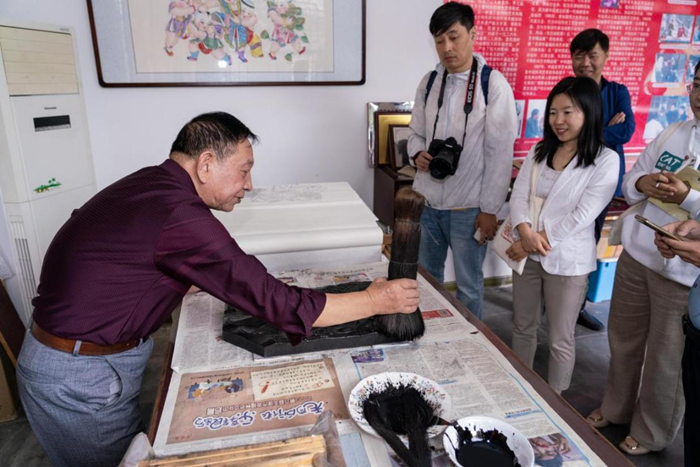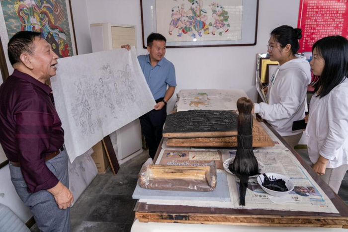 9月26日,在天津市西青区杨柳青镇玉成号画庄,国家级非物质文化遗产杨柳青木版年画传承人霍庆顺正在展示印刷后的杨柳青木版年画。新华网 钟奕 摄