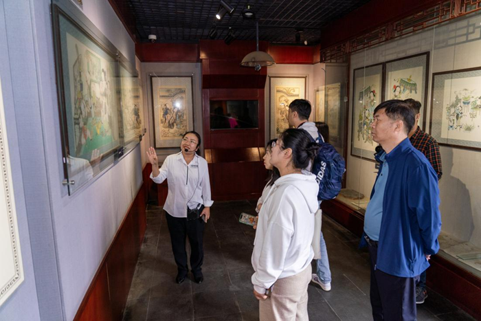 9月26日,在天津市西青区杨柳青镇杨柳青年画馆,志愿者正在介绍国家级非物质文化遗产杨柳青木版年画。新华网 钟奕 摄