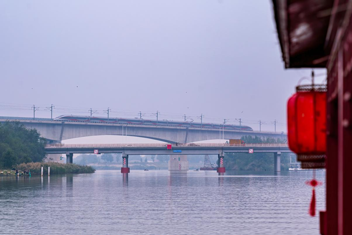 9月26日,在天津市西青区杨柳青镇白滩寺村,一列复兴号动车组正驶过子牙河铁路桥。新华网 钟奕 摄
