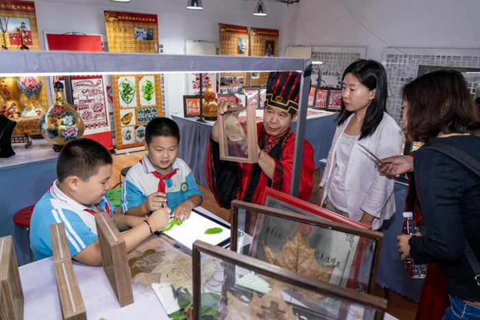 9月26日,在天津市传统文化研学基地,志愿者正在介绍叶画制作的传统技艺。新华网 钟奕 摄