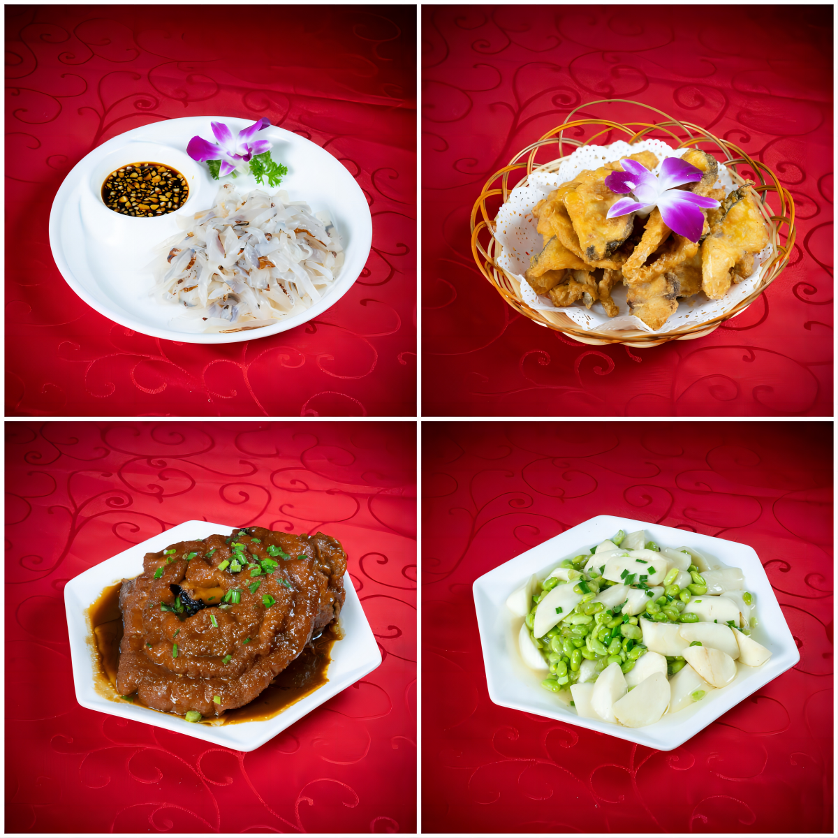 平湖味·简约婚宴菜单部分代表菜品:白沙红霞(左上);年年有余(右上);圆圆满满(左下);珠联璧合(右下)。