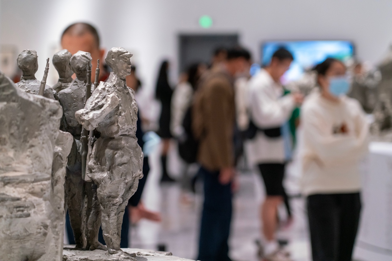 2023年12月12日,游客们在广州艺术博物院欣赏“塔高水长——中国美术馆藏美术精品展之长征精神、延安精神”主题特展。新华网 钟奕 摄