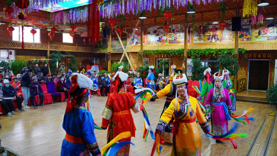 赤峰市翁牛特旗赛沁塔拉嘎查牧民在农牧民食堂开展“送欢乐 送文明”文艺演出活动。 新华网发 (赤峰市翁牛特旗乌丹镇人民政府工作人员 张月彬 摄)