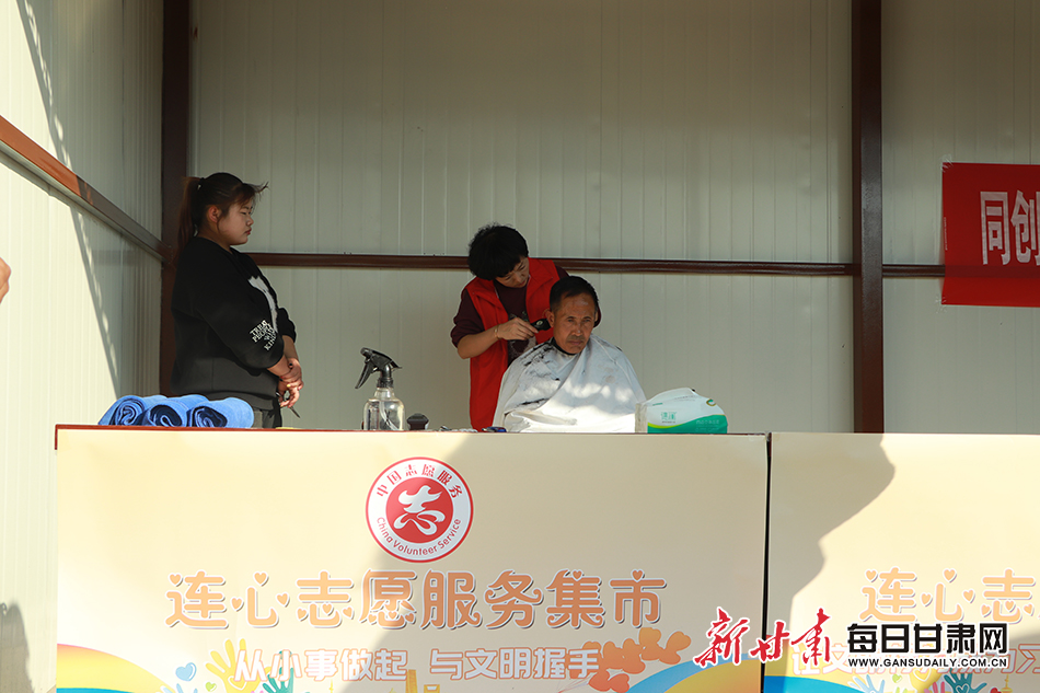 10月14日,兰州市红古区花庄镇湟兴村连心志愿服务集市上,志愿者在为老人理发。记者郭林玉 摄