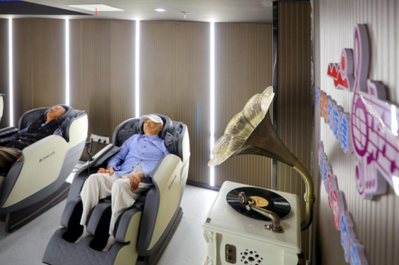 2024年9月28日,安徽省六安市叶集区史河街道柳林社区新时代文明实践站,社区居民一边欣赏音乐一边体验自助式理疗。新华网发 (田凯平 摄)