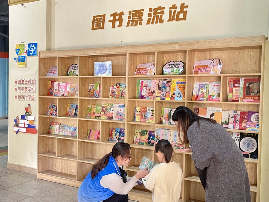 11月1日,泰山公馆小区架空层图书漂流站志愿者正在给小朋友讲故事。新华网 张群 摄