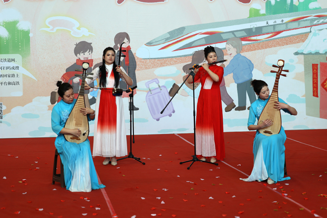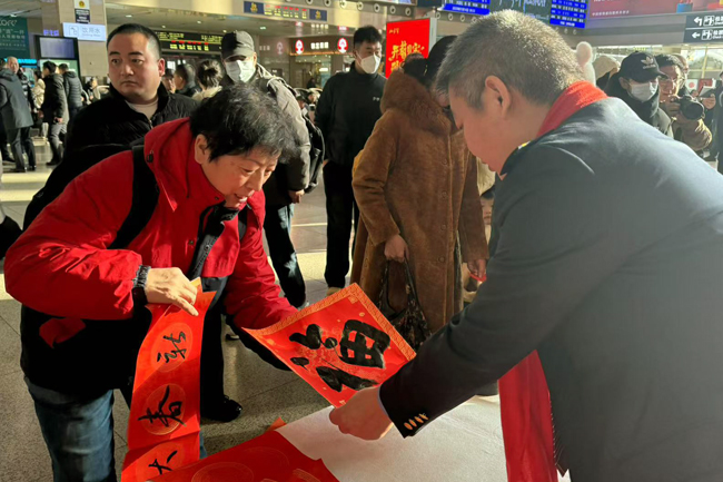 “大娘,这个‘福’字送给您,祝您身体健康,阖家幸福。”国铁沈阳局书法文艺骨干挥毫泼墨,现场为旅客书写“福”字和春联,为旅客们回家的行囊中增添了一份节日的喜庆,也将最美好的祝福送到南来北往的旅客心中。国铁沈阳局的文艺骨干们还用嘹亮的歌声、优美的舞姿为旅客们带来精彩的演出。