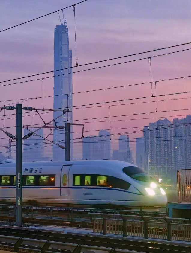 天津南站,飞驰在朝霞中的“和谐号”高铁列车。中国文明网网友@钟奕 摄