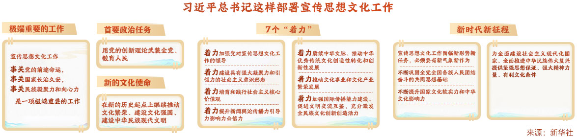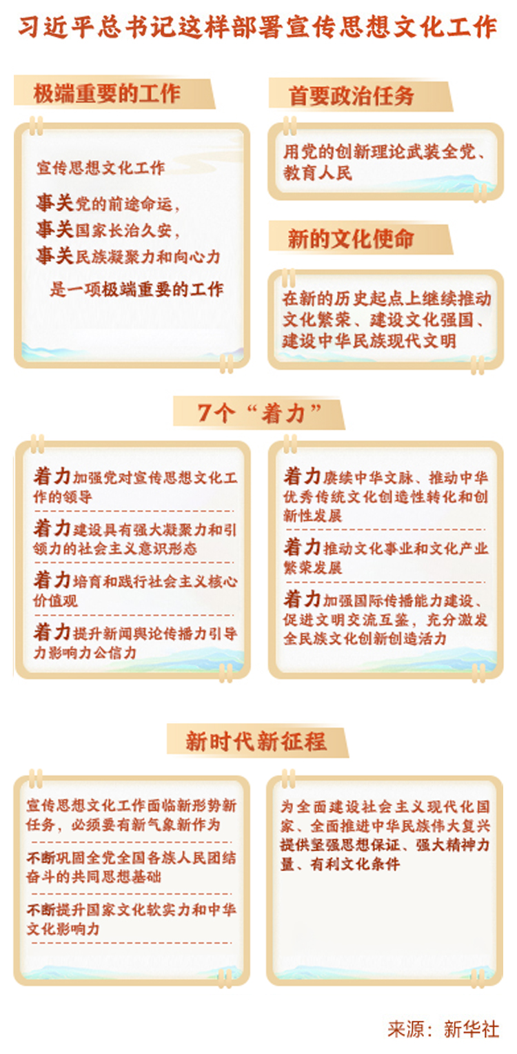 10月7日至8日,全國宣傳思想文化工作會議在京召開。會議傳達了習近平總書記對宣傳思想文化工作的重要指示,并首次提出習近平文化思想。習近平:堅定文化自信秉持開放包容堅持守正創(chuàng)新 為全面建設(shè)社會主義現(xiàn)代化國家全面推進中華民族偉大復(fù)興提供堅強思想保證強大精神力量有利文化條件。