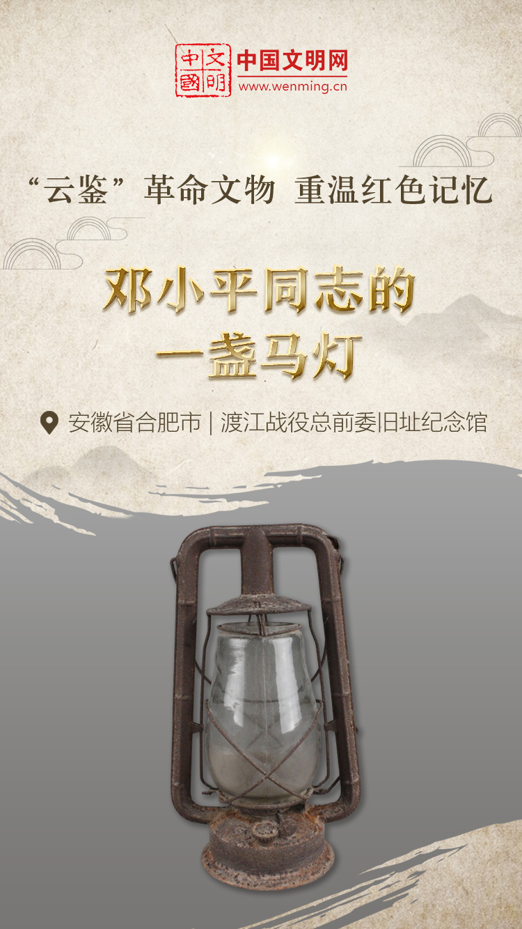 革命文物,承载党和人民英勇奋斗的光荣历史,是弘扬革命传统和革命文化、加强社会主义精神文明建设、激发爱国热情、振奋民族精神的生动教材。中国文明网“文明之声·云鉴馆藏”专栏邀您走进各地革命博物馆、纪念馆、党史馆等红色主题场馆,一起“打卡”红色地标,“云鉴”红色馆藏,汲取奋进力量。今天为您介绍渡江战役总前委旧址纪念馆的馆藏文物——邓小平同志的一盏马灯。